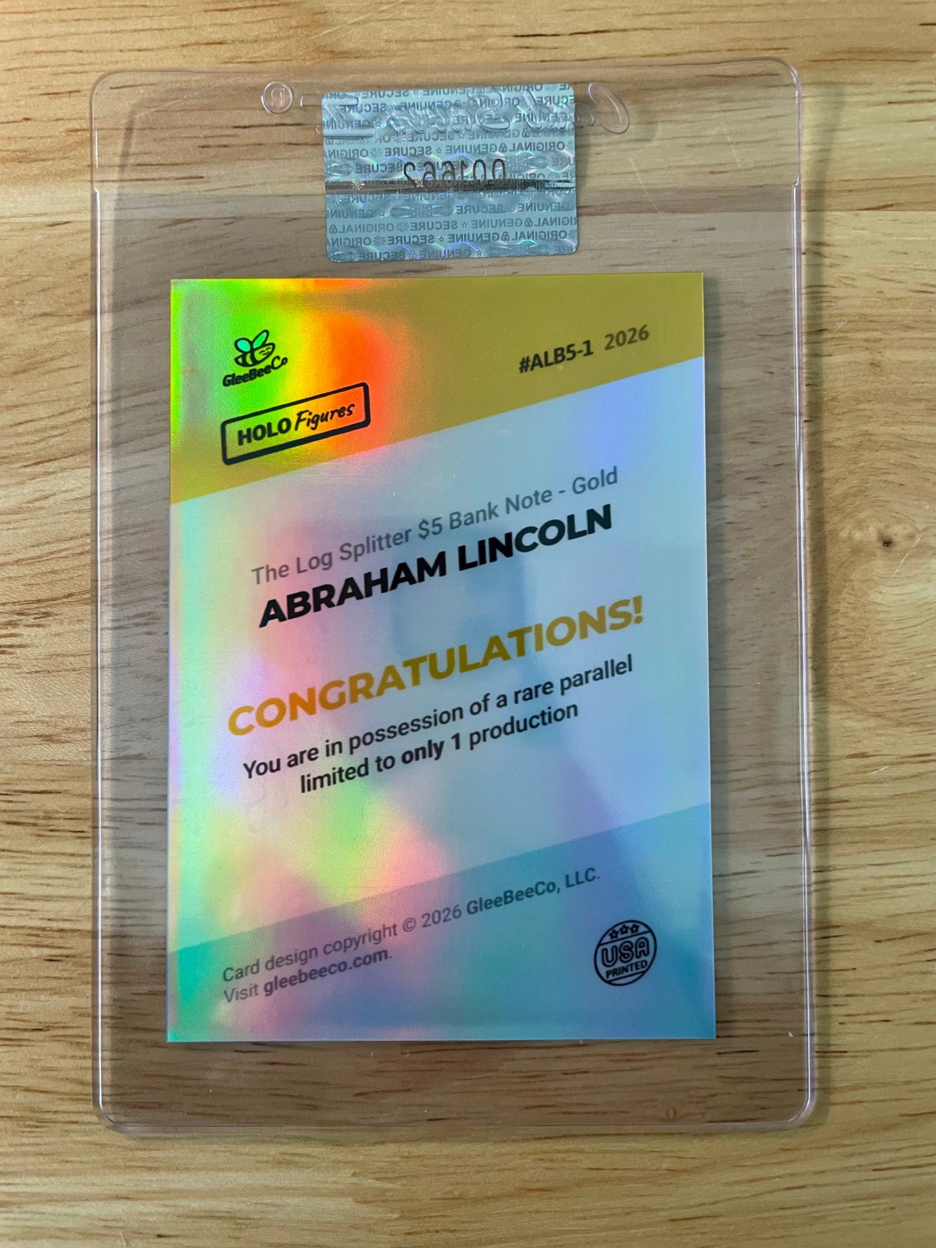 Own a stunning Abraham Lincoln Rail Splitter gold bank note card, designed in the style of a vintage $5 silver certificate with ornate detailing and Lincoln’s iconic portrait at center. This 1/1 trading card features a vibrant holographic finish that shift across the surface, enhancing its collectible appeal. Produced by GleeBeeCo in 2026, it blends historical Americana with modern card artistry. A truly unique President Lincoln trading card and standout piece for collectors of currency-inspired designs and presidential memorabilia.