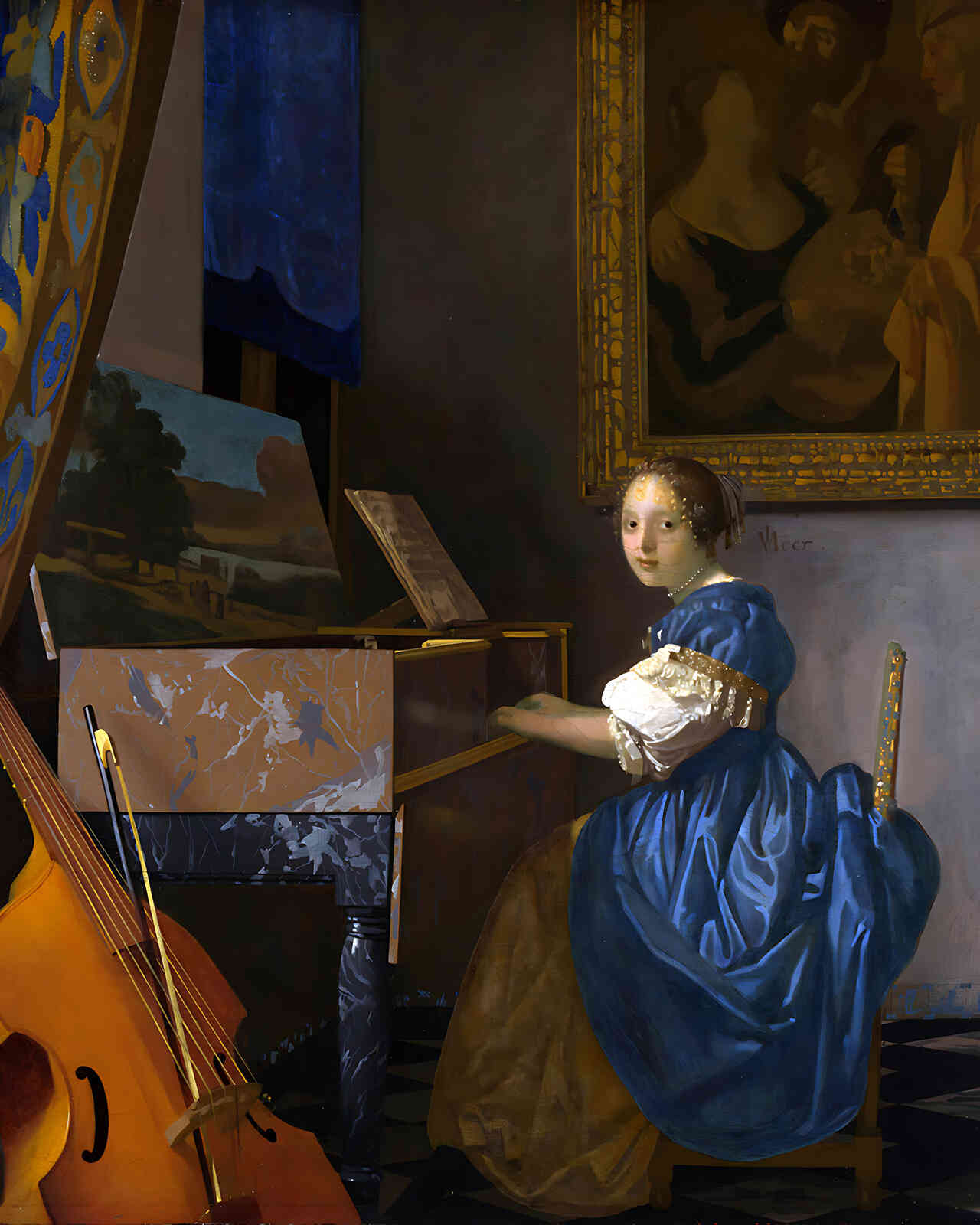 Printed on high-quality, archival grade paper, this art print honors Vermeer's meticulous craftsmanship and ensures lasting visual appeal. The setting, with its draped blue curtain and the intriguing painting on the wall, invites interpretation and conversation, reflecting the layered meanings often found in Vermeer's work. Whether displayed in a living space, study, or creative workspace, this print of A Young Woman Seated at a Virginal connects viewers to the rich cultural history of the Netherlands, offering both aesthetic pleasure and a sense of historical connection. Enjoy the timeless charm of Johannes Vermeer's art with every look.