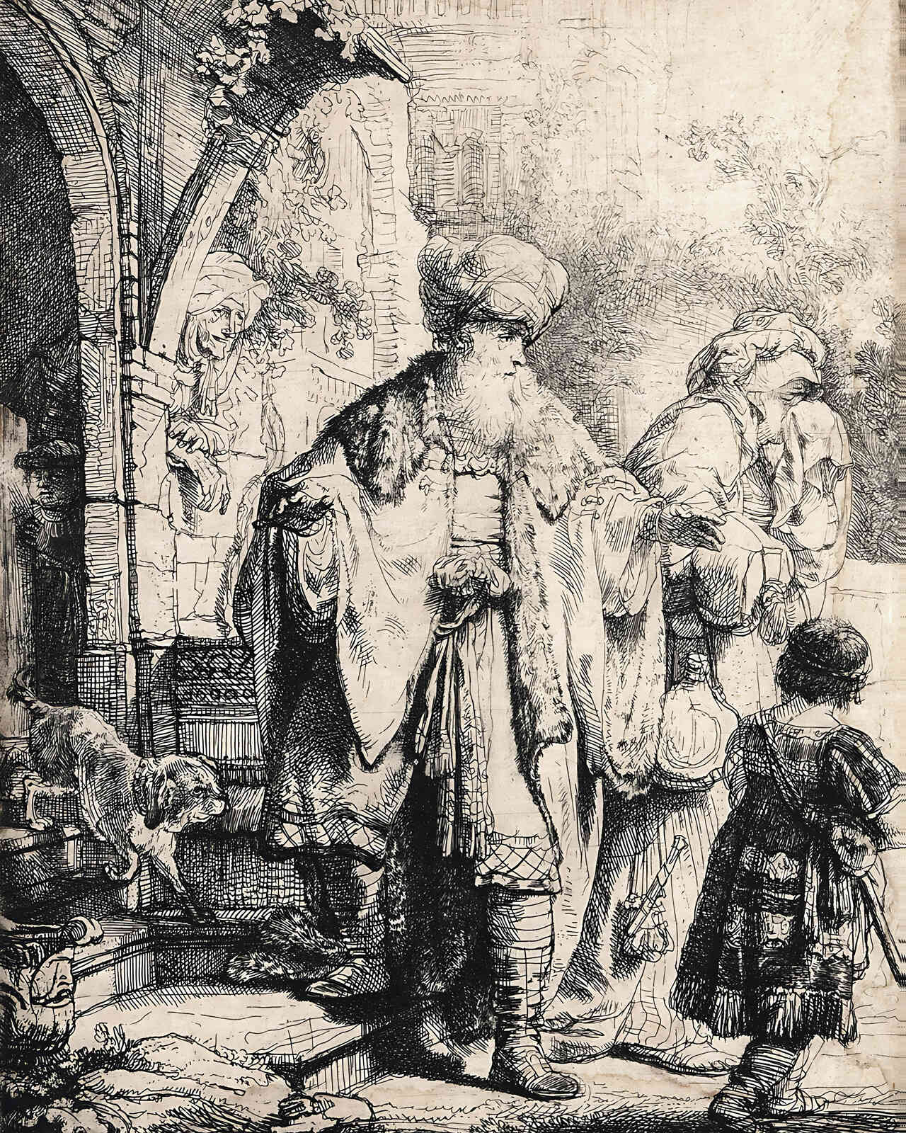 This art print, titled "Abraham Dismissing Hagar," is a masterpiece by Rembrandt, created in 1637. It captures a poignant moment from biblical history, where Abraham, at Sarah's insistence, sends away his former consort Hagar and their son Ishmael into the wilderness. The scene is imbued with emotional depth, as Rembrandt's etching conveys the complexity of Abraham's decision. The details, such as Hagar holding a handkerchief and carrying a knapsack, add to the narrative's authenticity. This print is a testament to Rembrandt's skill in storytelling through art.