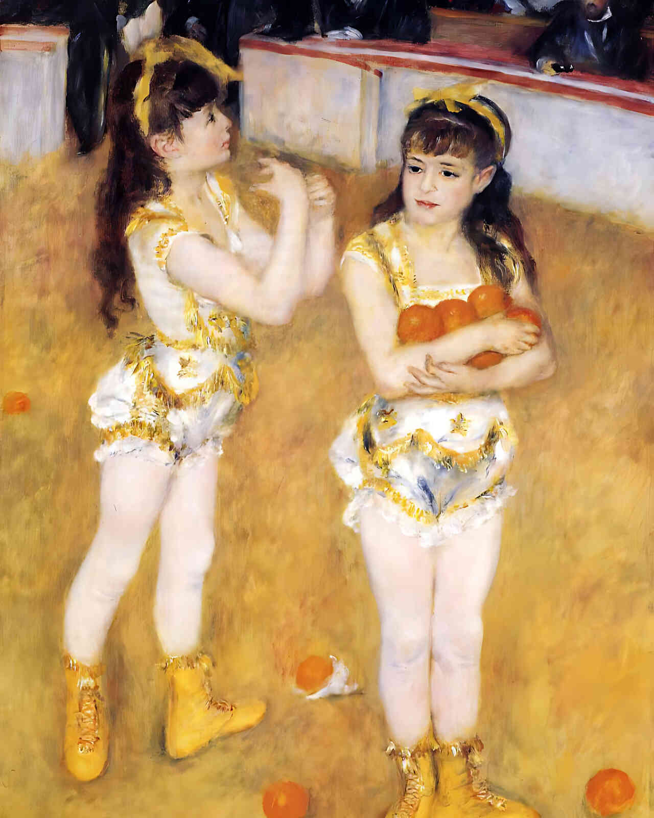 Step into the vibrant world of 19th-century Paris with this stunning art print of Pierre-Auguste Renoir's "Acrobats at the Cirque Fernando (Francisca and Angelina Wartenberg)" from 1879. Renoir brilliantly captures the youthful energy and charm of sisters Francisca and Angelina Wartenberg as they take their bows after a circus performance, wrapping up oranges tossed by the audience-a delightful tribute to their talent. The masterful use of thin, translucent oil washes and soft violet outlines creates a sense of immediacy and intimacy, as if you're peering through opera glasses from the best seat in the house. This print invites viewers to experience the warmth and magic of the circus through the eyes of one of Impressionism's greatest artists.