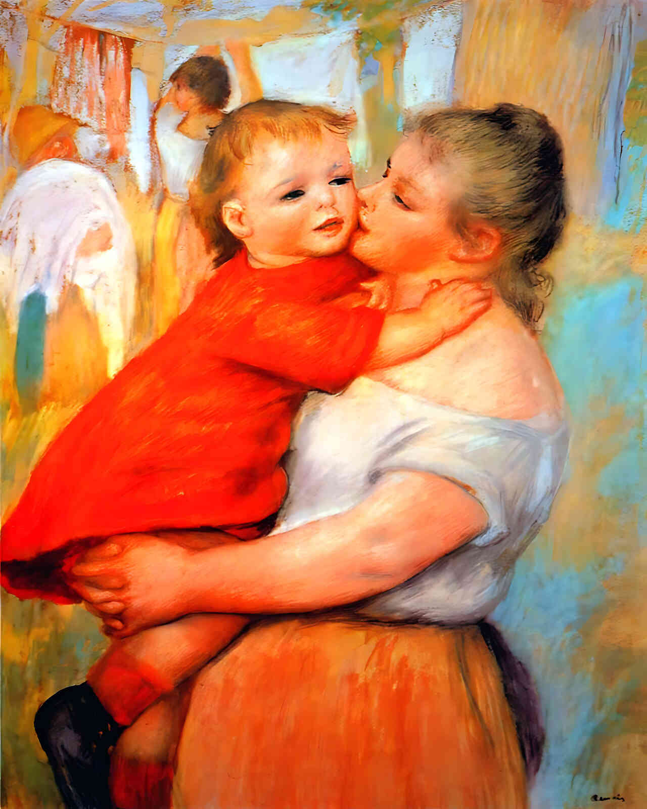 The artwork is an idealization of motherhood and rural life, showcasing Renoir's skill in capturing the fleeting effects of light and color. The composition exudes a sense of serenity and maternal love, as Aline's serene expression and gentle hold on Pierre convey a deep affection. Renoir's masterful use of color and light creates a chromatically exuberant image that is both lively and intimate. This art print is a beautiful tribute to Renoir's artistic vision, offering a unique blend of warmth and beauty that can enhance any room with its presence. By choosing this print, you can appreciate the artistic genius of Renoir in a way that feels both personal and elegant.