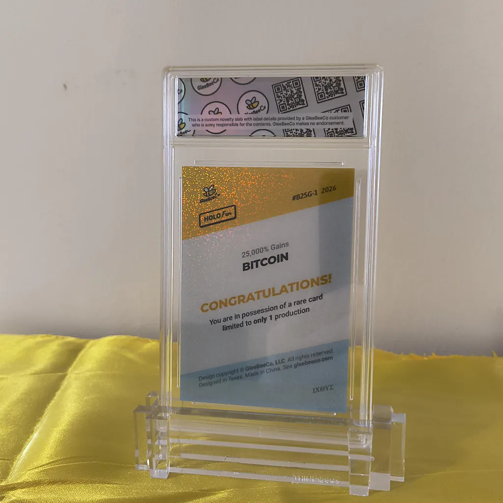 That's right, you can slab your own card at home with a custom holographic label. Enter your text for the label and we'll ship it to you with a snap-close slab. Just insert your card and the label and press down to finish. Be sure to add a stand for displaying your new slabbed card. A protective bag is included to help protect your slab from scratches.