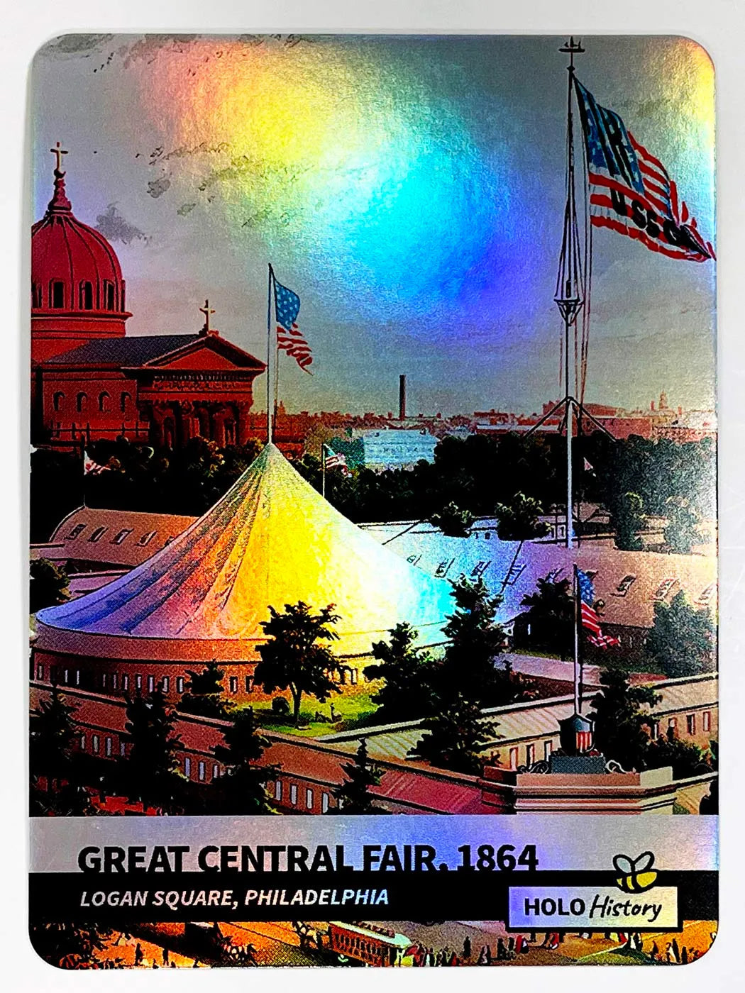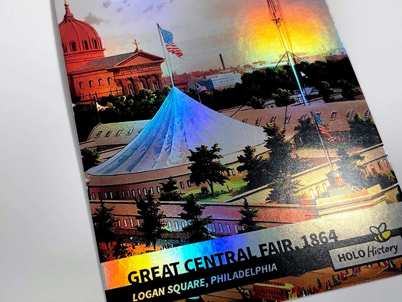This beautifully illustrated trading card shows the 1864 Great Central Fair in Logan Square, Pennsylvania and is part of GleeBeeCo's 2023 Holo History card series.